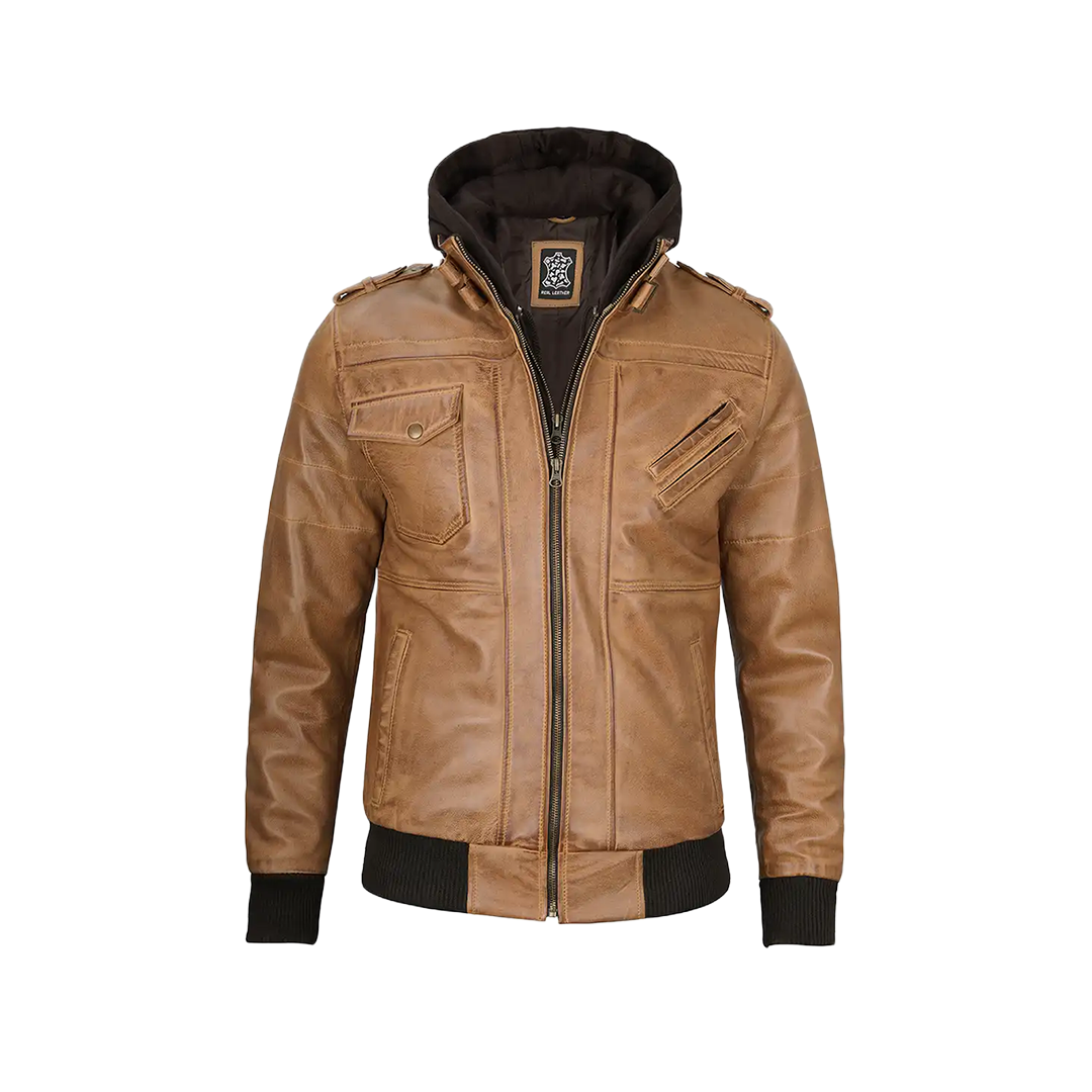 Redefine casual sophistication with this versatile camel brown leather jacket. Expertly crafted from 100% genuine lambskin leather, this bomber-style jacket combines premium materials with functional design, complete with a detachable hood for adaptable styling.