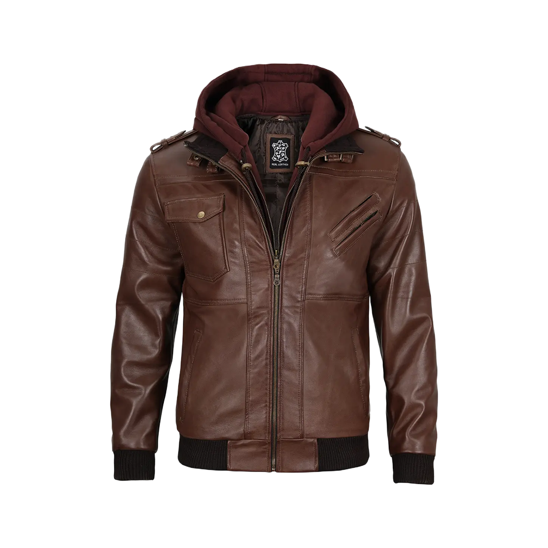 Master rugged sophistication with this premium dark brown lambskin bomber, featuring a convertible hood design for ultimate versatility. Handcrafted for the modern gentleman who values both timeless style and practical functionality.