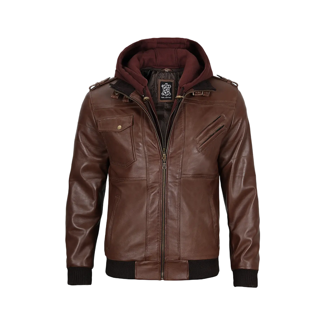 Elevate your style with this rugged yet refined dark brown leather bomber, featuring a removable hood for versatile looks. Crafted from premium lambskin, this jacket delivers warmth, durability, and head-turning appeal for any occasion.