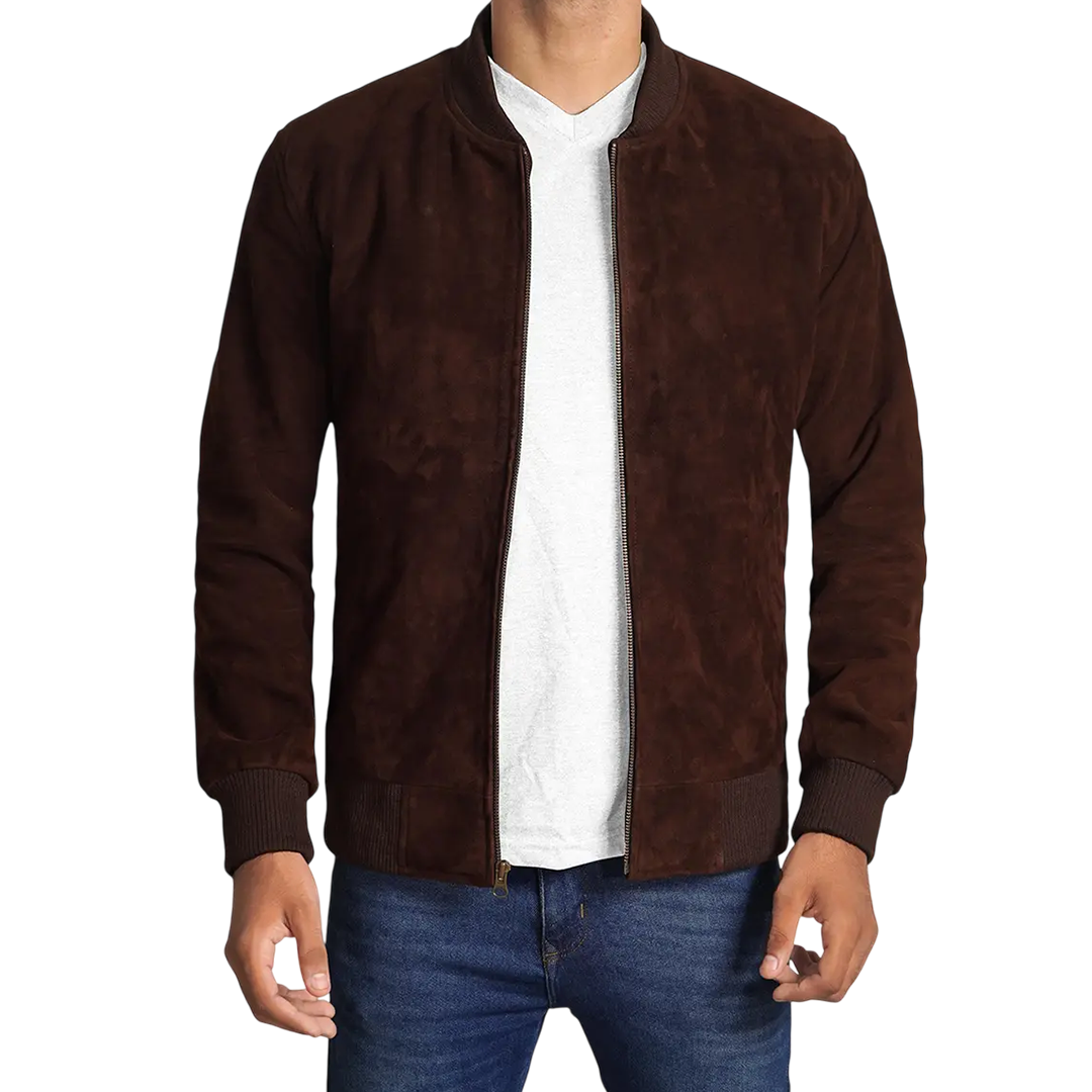 Own the season with confidence in the Men’s Dark Brown Suede Bomber Jacket—a modern classic for the well-dressed man.