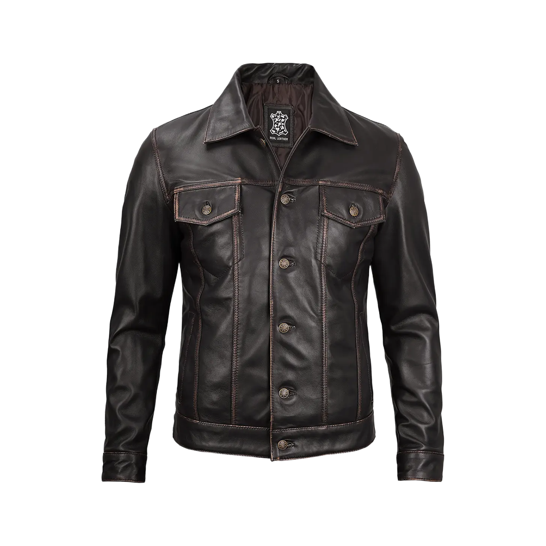Channel rugged sophistication with this vintage-inspired dark brown leather trucker, featuring authentic distressed detailing that gets better with age. The rich, lived-in finish and classic trucker silhouette create instant character for your casual wardrobe.