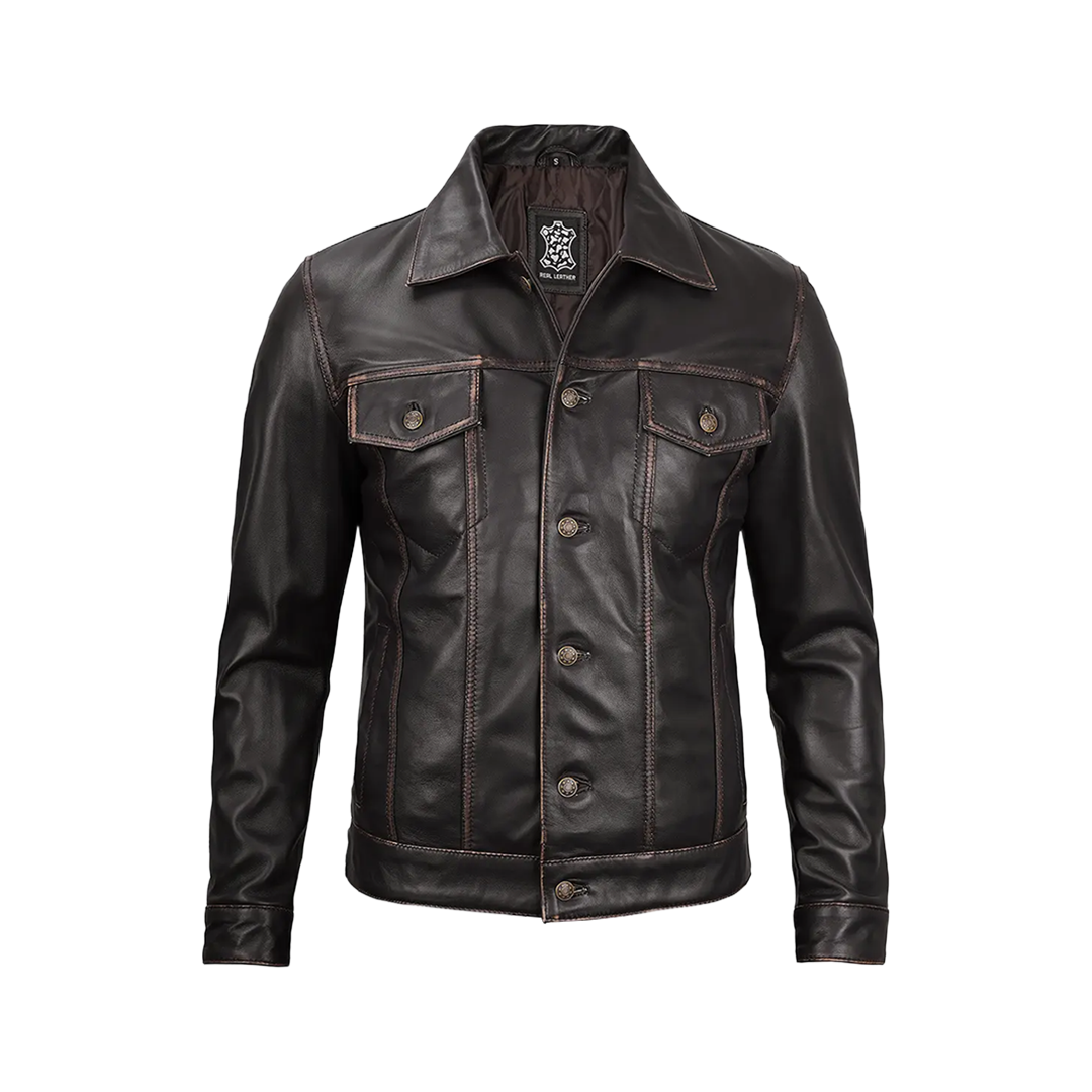 Crafted from 100% genuine lambskin leather, this distressed brown trucker jacket blends vintage character with modern wearability. The button-front design and shirt collar offer timeless appeal, while functional pockets keep essentials secure.