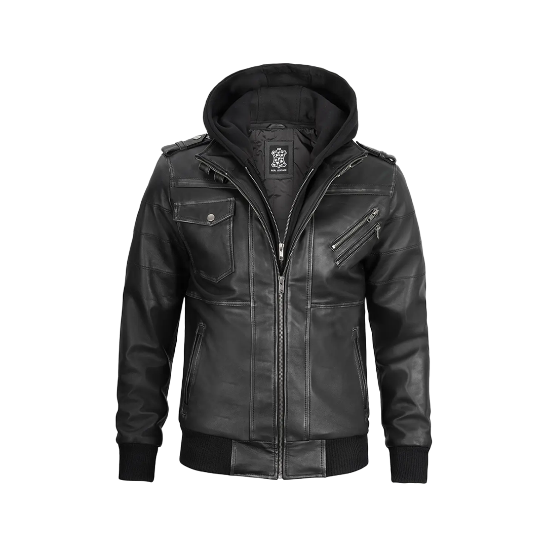 Master urban sophistication with this sleek dark gray leather bomber, blending premium craftsmanship with modern functionality. The removable hood and rib-knit detailing create a versatile jacket that transitions effortlessly from casual to polished looks.