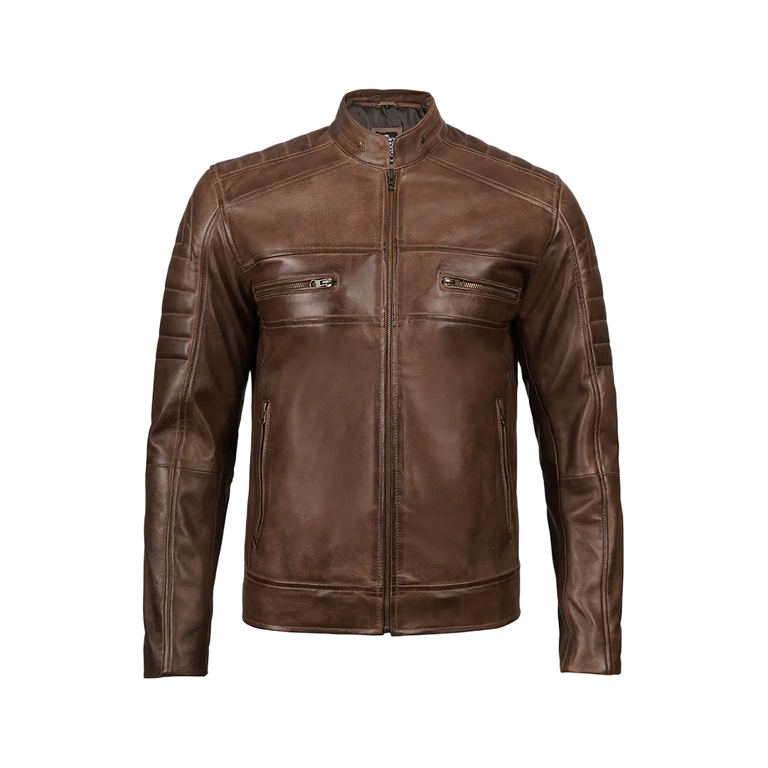 Crafted from 100% genuine lambskin leather, this coffee brown cafe racer jacket features an artfully distressed finish that delivers instant vintage character. The rugged yet refined design pays homage to classic motorcycle heritage while offering modern comfort.