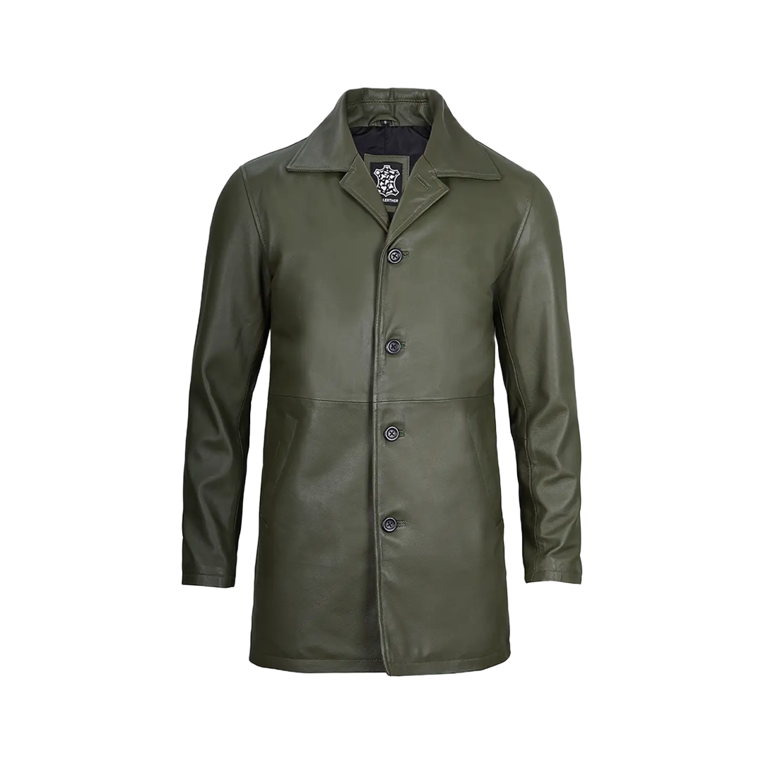Command attention with this striking military green leather car coat, expertly crafted from 100% genuine lambskin leather. The distinctive color and tailored 3/4 length silhouette create a contemporary statement piece that elevates both casual and refined ensembles.