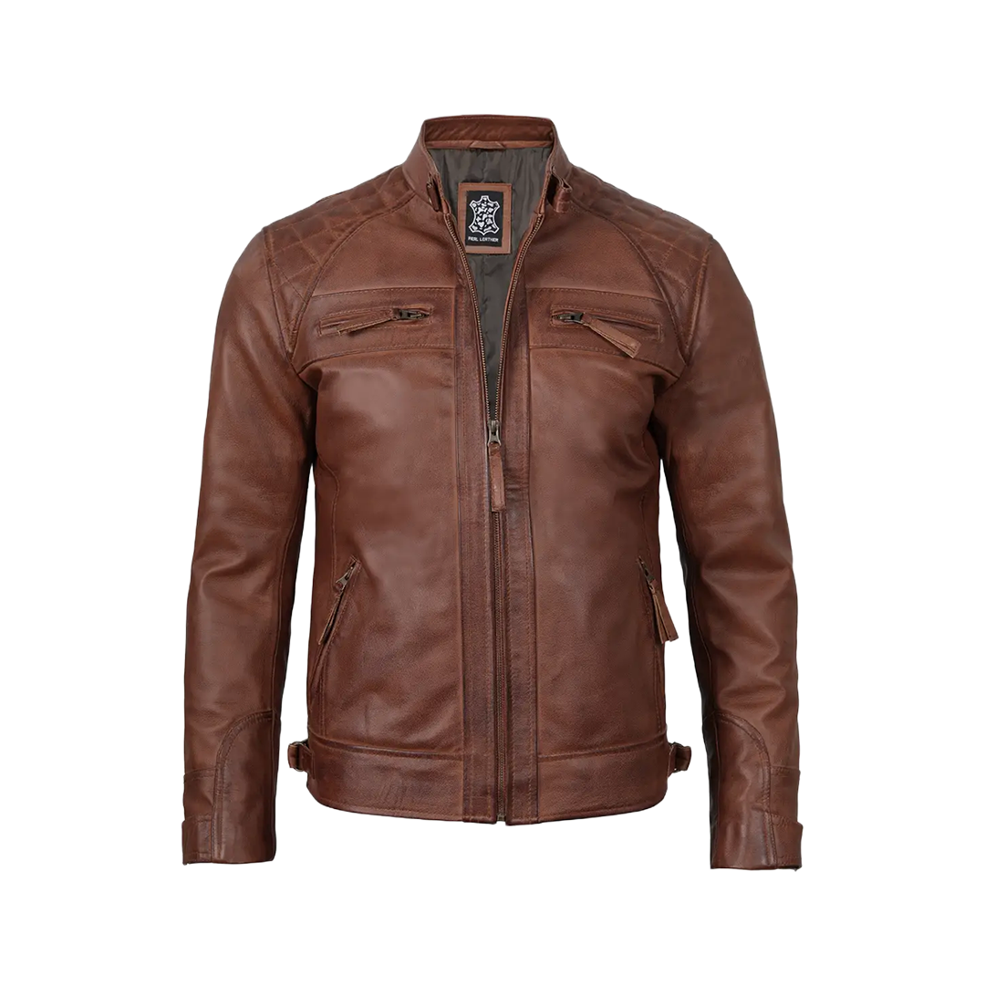 Elevate your style with this vintage-inspired leather jacket designed for taller men (6'0" - 6'4"). Crafted from 100% genuine lambskin leather, this cafe racer combines classic motorcycle heritage with rich cognac tones and distinctive diamond detailing.