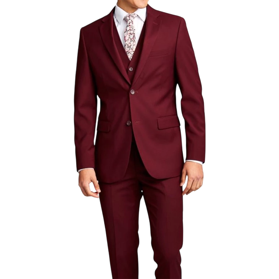 Command attention in this rich maroon three-piece suit, where deep burgundy elegance meets contemporary tailoring. Designed for the modern gentleman who values both timeless style and standout flair, this ensemble transitions effortlessly from formal weddings to high-stakes business occasions, offering unmatched versatility with its coordinated vest.
