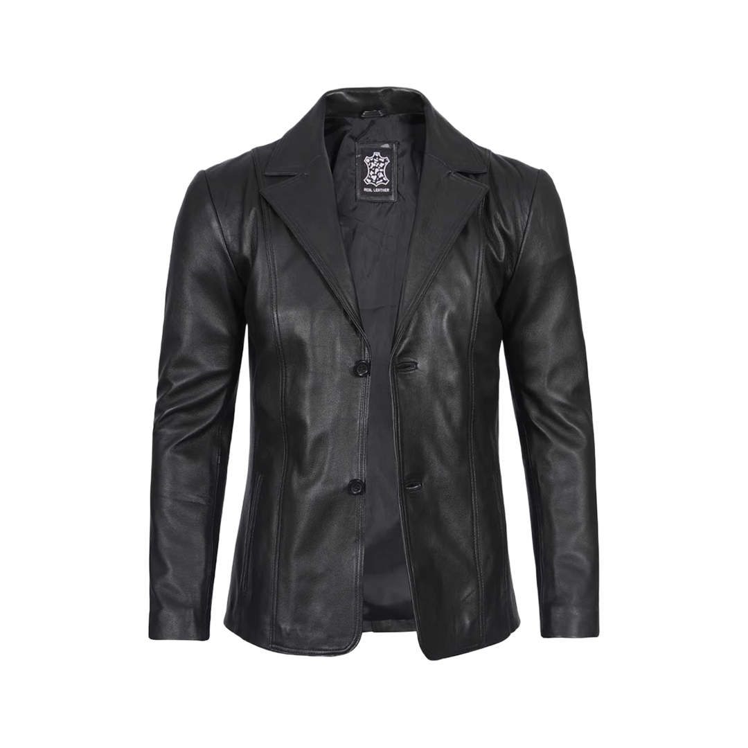 Command attention with this sleek black leather blazer, expertly tailored from 100% genuine lambskin leather. The minimalist two-button design and classic notch lapel create a versatile piece that effortlessly bridges formal and contemporary style.