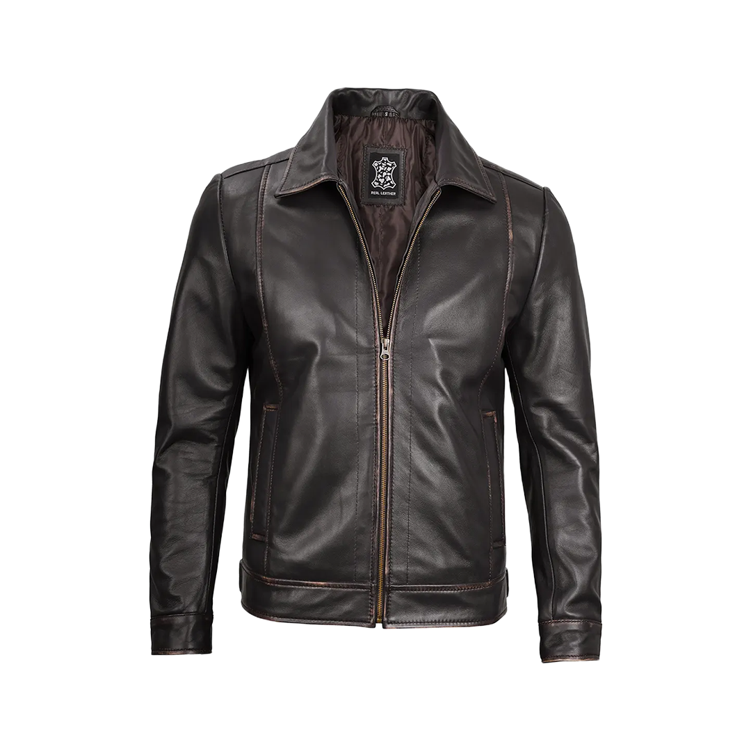 Crafted from 100% genuine lambskin leather, this vintage-inspired jacket features a distressed dark brown finish that exudes rugged sophistication. The shirt collar design and lightweight construction make it perfect for everyday wear.