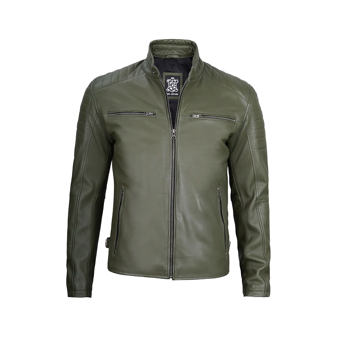 Command attention with this rugged yet refined military green cafe racer. Meticulously crafted from 100% genuine lambskin leather, this jacket blends timeless biker aesthetics with practical functionality for the modern adventurer.