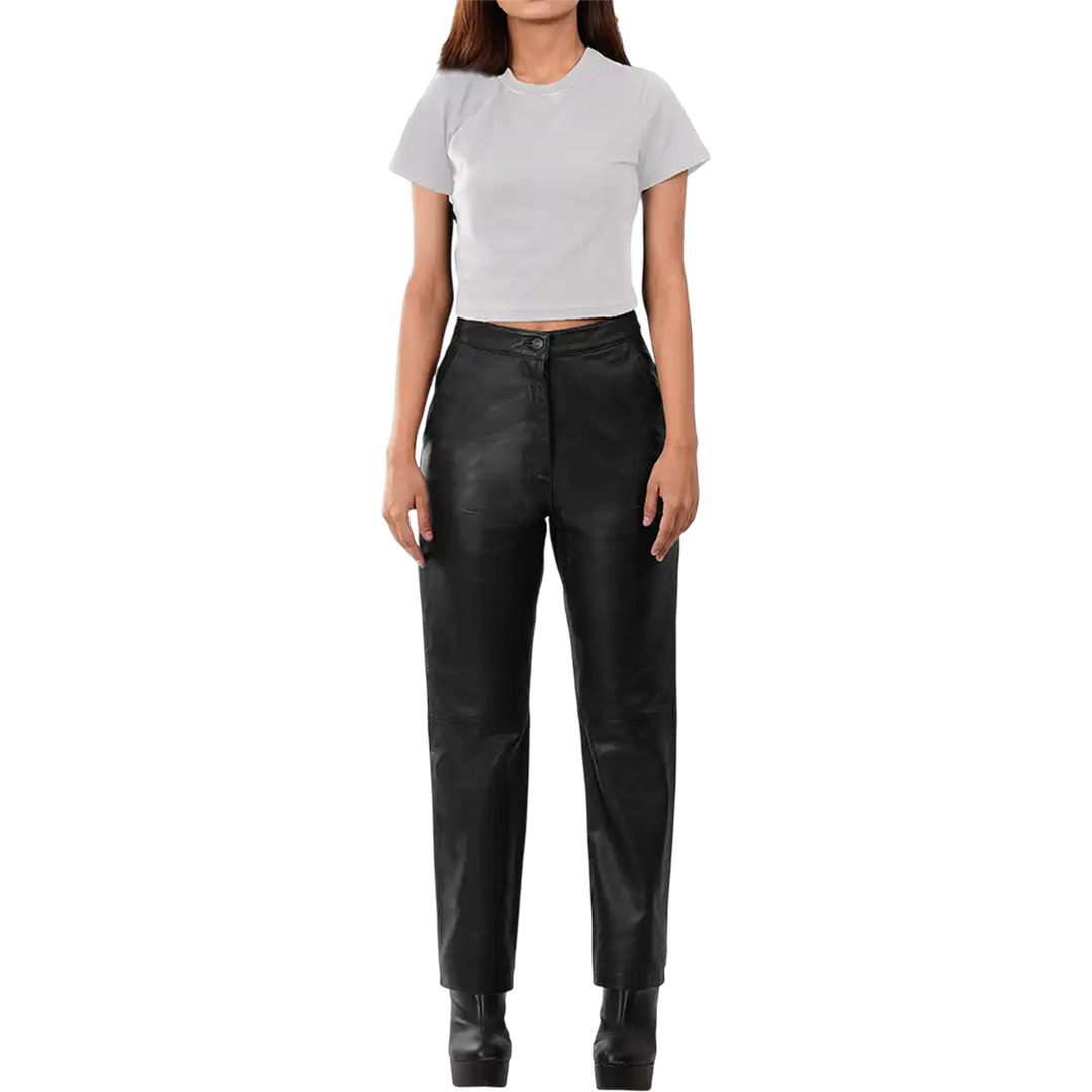 Elevate your everyday style with the Myrna Women's Black Fitted Leather Pants. Designed to flatter, these pants offer a sleek silhouette with a high-rise waist and tailored fit—ideal for modern women who appreciate both edge and elegance.