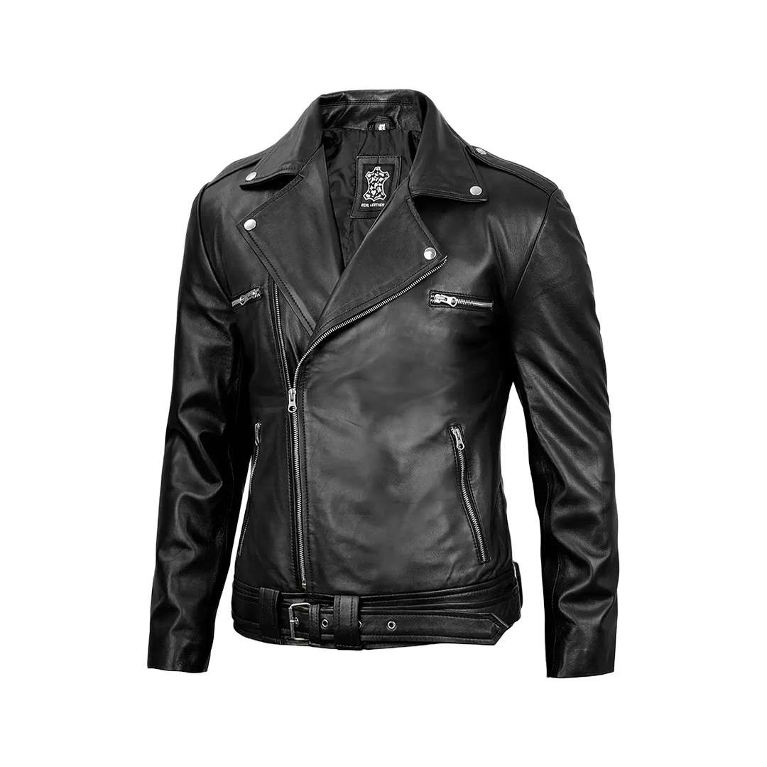 Command attention with this asymmetrical biker jacket, crafted from 100% genuine lambskin leather. The bold zipper design and belt detailing create an unmistakable edge, perfect for making a statement.