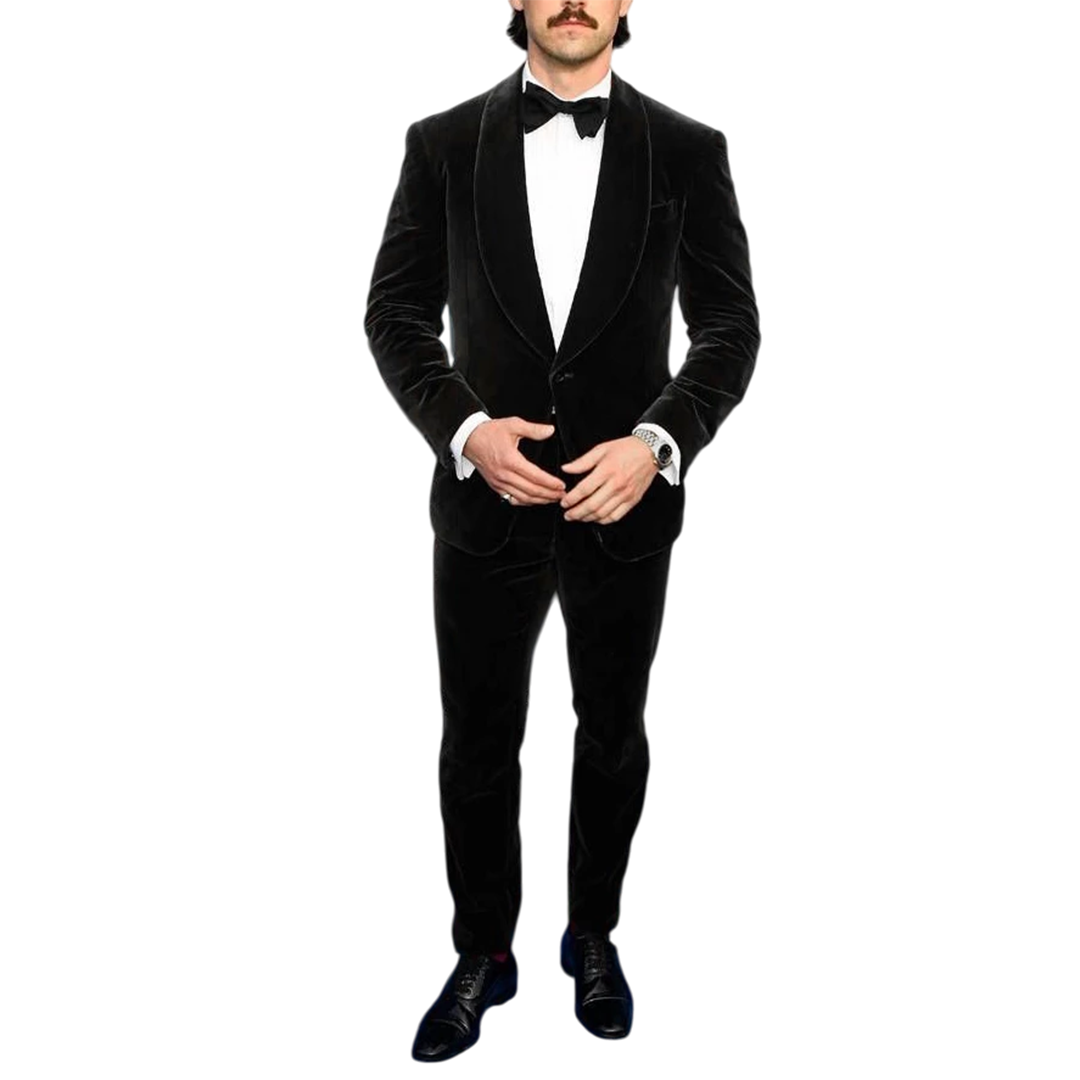 Step into the spotlight with this breathtaking black velvet tuxedo, where old-world Hollywood glamour meets modern sophistication. The fluid shawl collar—crafted from lustrous satin—creates an uninterrupted line of elegance, while the plush velvet fabric ensures you’ll be the best-dressed at any black-tie affair.