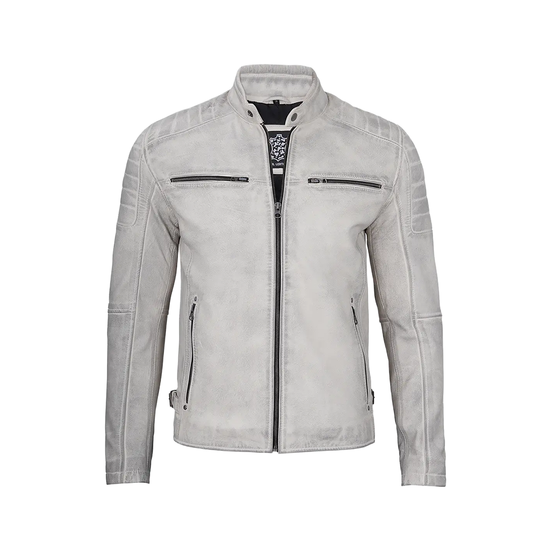 Make a statement with this unique waxed leather jacket. Expertly crafted from 100% genuine lambskin, this cafe racer combines a distinctive off-white grey hue with rugged waxed texture for head-turning style.
