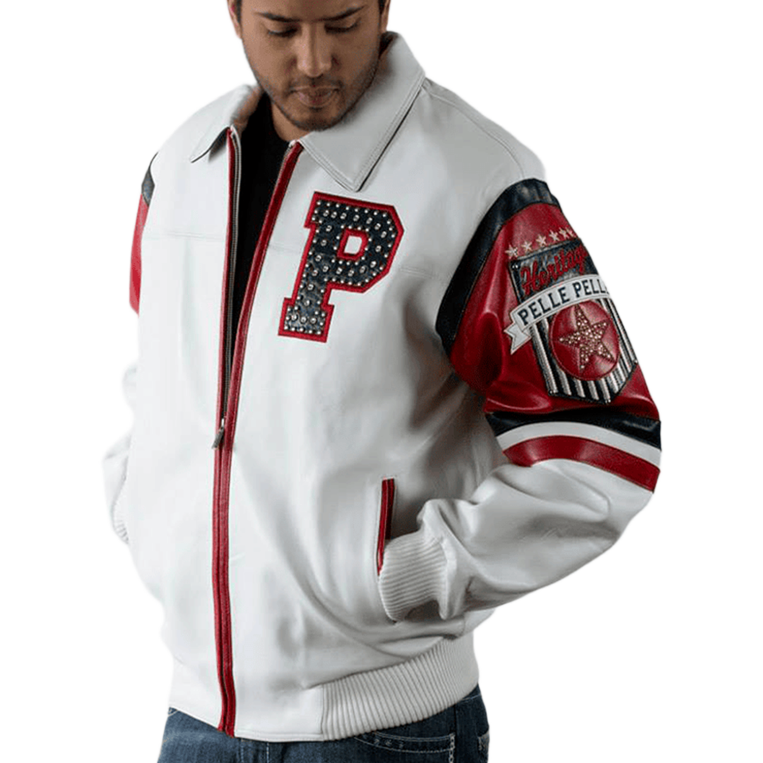 Stand out in style with the Pelle Pelle All American Heritage Series Jacket — a bold mix of vintage flair and modern edge in crisp white leather with striking details.