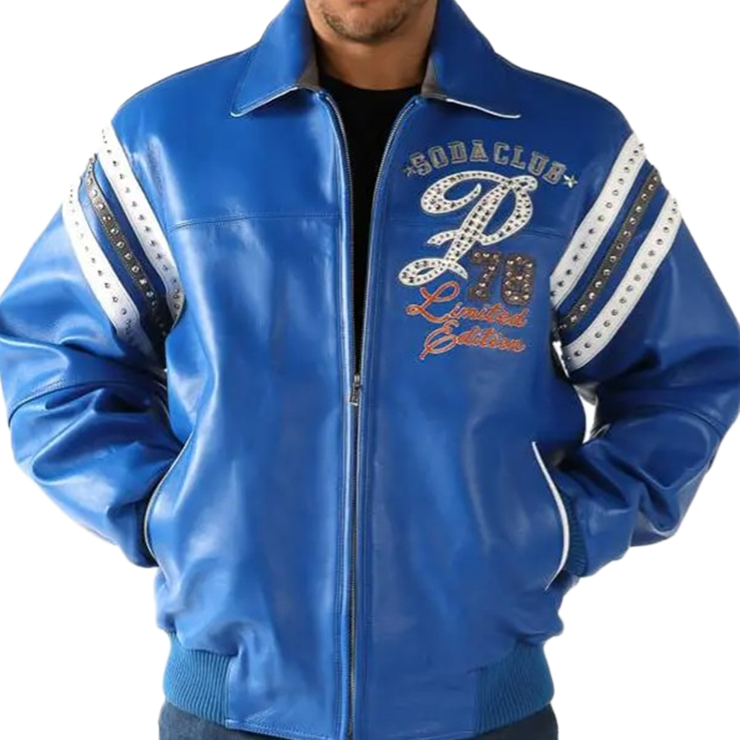 Bold and unmistakable, the Pelle Pelle Special Cut Soda Club Jacket stands out with its black and blue leather blend and studded detailing — a true collector's piece.