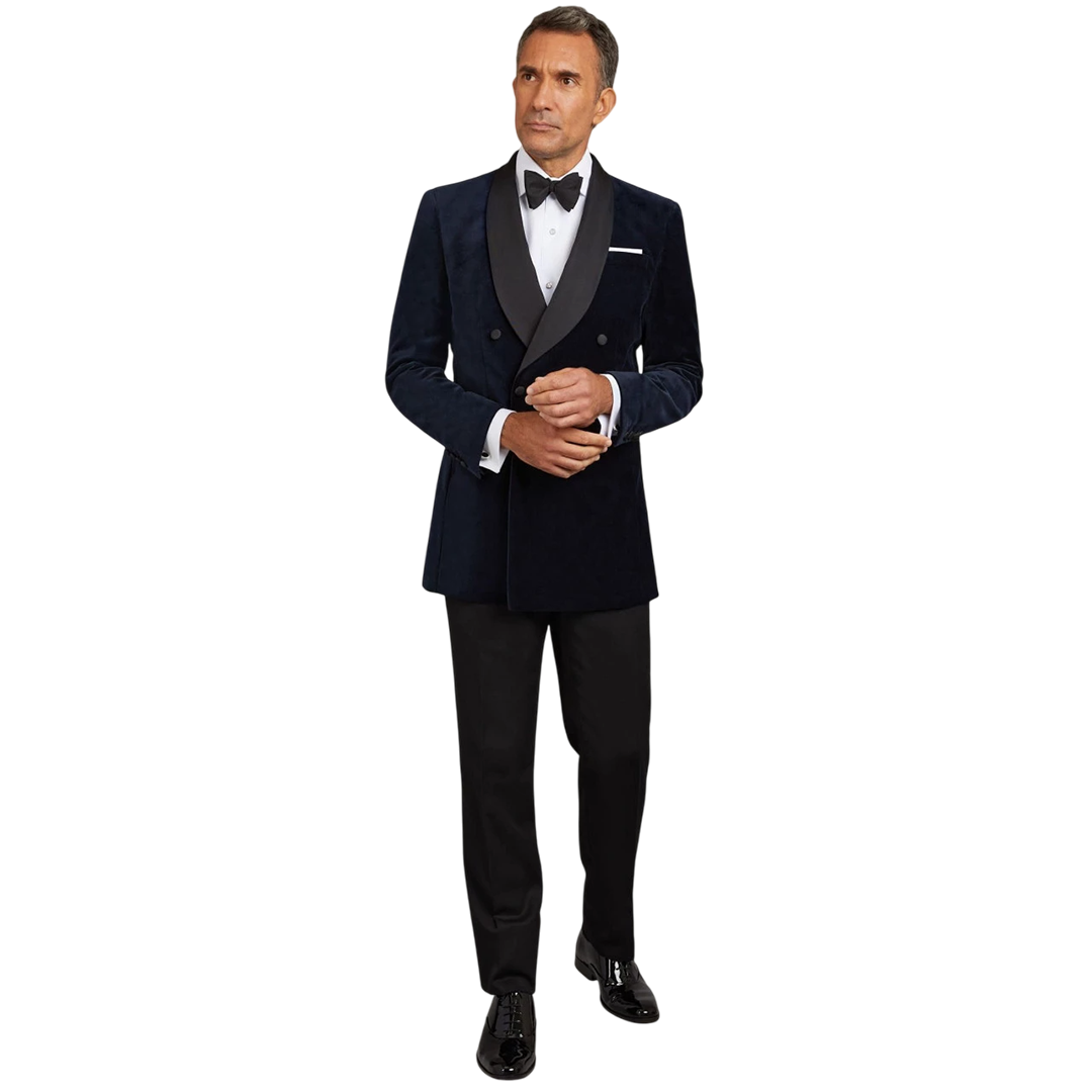 Make a grand entrance in this breathtaking blue velvet masterpiece, where old-world glamour meets contemporary sophistication. The fluid shawl collar—crafted from lustrous satin—wraps you in effortless elegance, while the double-breasted silhouette commands attention at every black-tie affair.