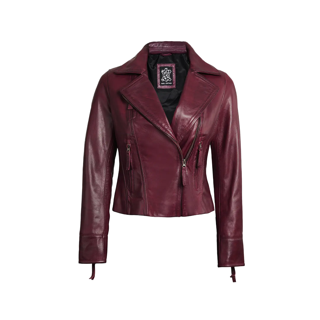 Channel confidence and charm with the Ramsey Women's Burgundy Leather Jacket — the ultimate blend of biker cool and sophisticated edge.