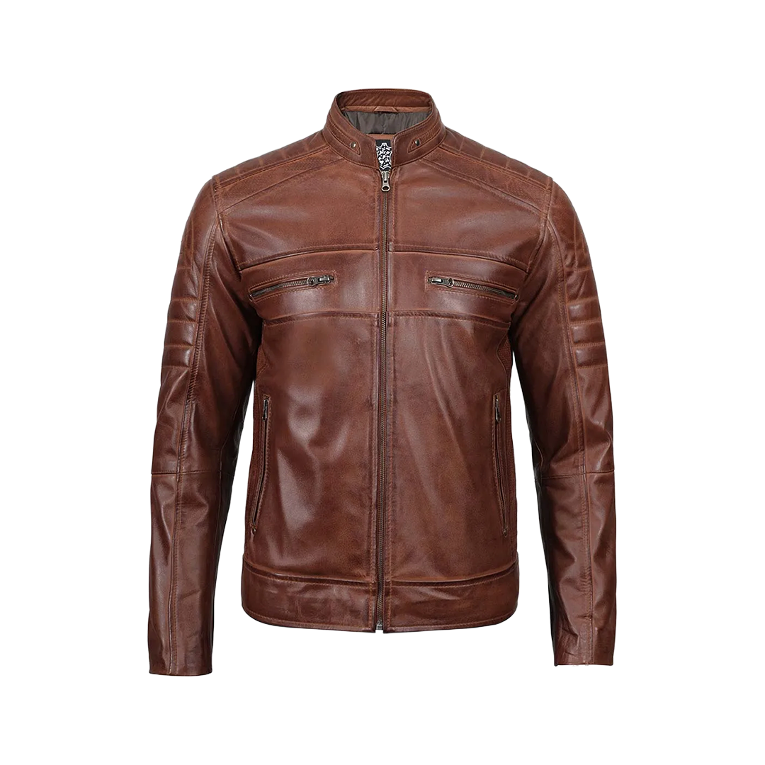Designed for taller men (6'0" - 6'4"), this vintage-inspired leather jacket combines style and comfort. Crafted from 100% genuine lambskin leather, it features a distressed cognac brown finish for a rugged, timeless look.