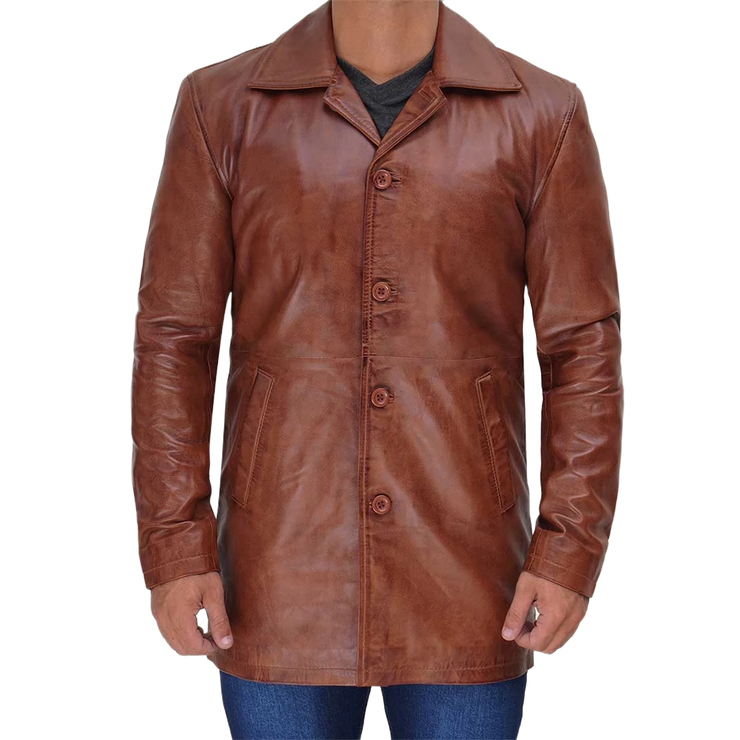 Step into timeless elegance with the Tan Tall Men's Distressed Leather Car Coat, designed exclusively for men 6'0"–6'4". Crafted from 100% real lambskin leather with a distressed finish, this ¾ length coat delivers vintage flair without compromising on modern comfort. Perfect for everything from urban commutes to weekend getaways.