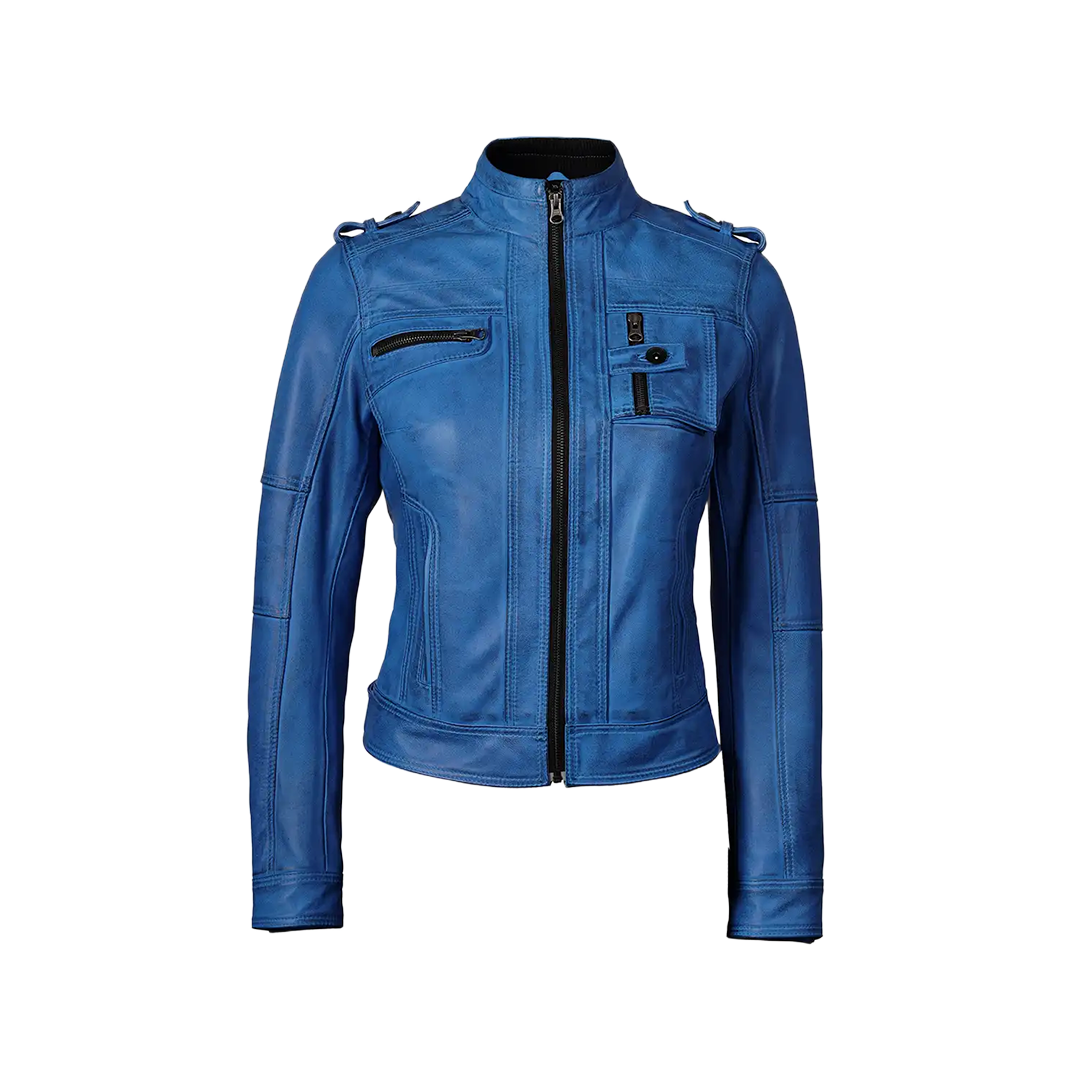 Make a statement wherever you go with the Tavares Distressed Blue Leather Jacket, a bold fusion of biker aesthetics and vintage flair. Designed for women who value individuality and confidence, this jacket turns everyday wear into a style moment.