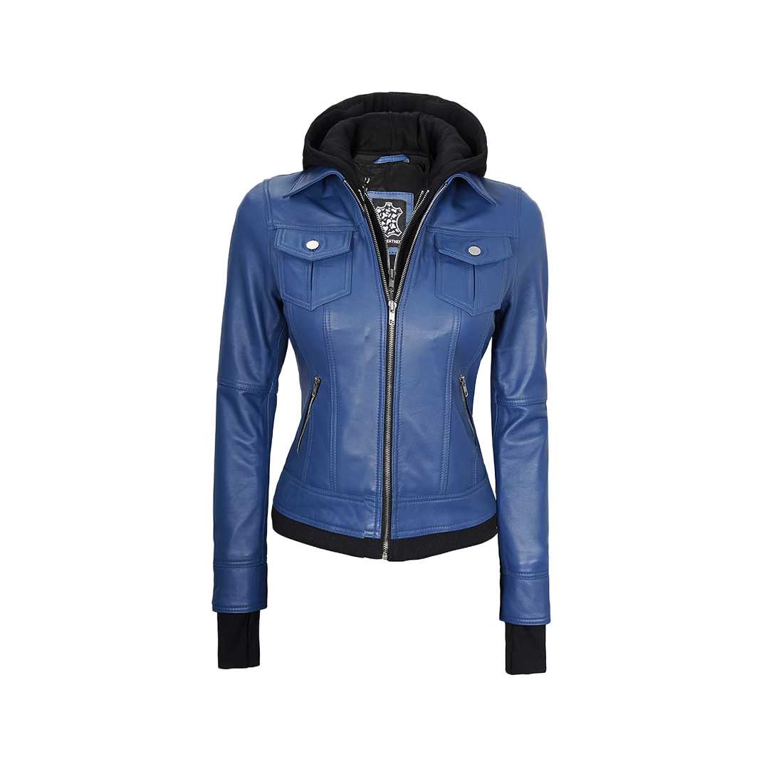 Add a vibrant edge to your outerwear collection with the Tralee Women's Blue Leather Jacket. Crafted from 100% real lambskin leather, this jacket strikes the perfect balance between premium style and everyday comfort. The rich blue hue adds a refreshing pop of color to your wardrobe, while the detachable hood brings effortless versatility.