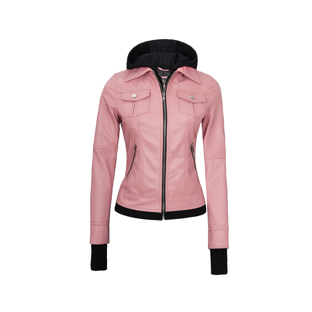 Elevate your everyday wardrobe with the Tralee Pink Hooded Leather Bomber Jacket—a bold, beautiful outerwear piece designed to keep you warm and stylish wherever you go.