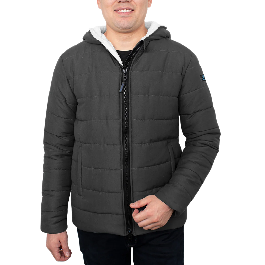 Conquer winter in rugged sophistication with this dark gray puffer, expertly engineered for temperatures down to 14°F (-10°C). The plush sherpa lining and recycled insulation deliver sustainable warmth, while the stormproof design stands up to harsh winter conditions.
