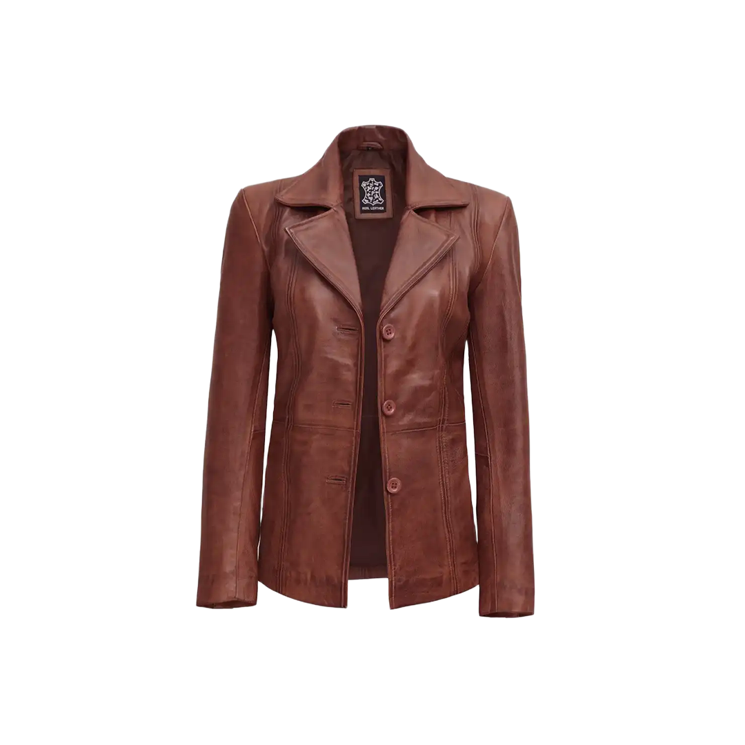 Discover the perfect balance of classic sophistication and modern style with our Women’s Cognac Brown Three Button Leather Blazer. Crafted from 100% real lambskin leather, this blazer offers a luxurious, soft feel paired with a timeless cognac brown finish that enhances any outfit.