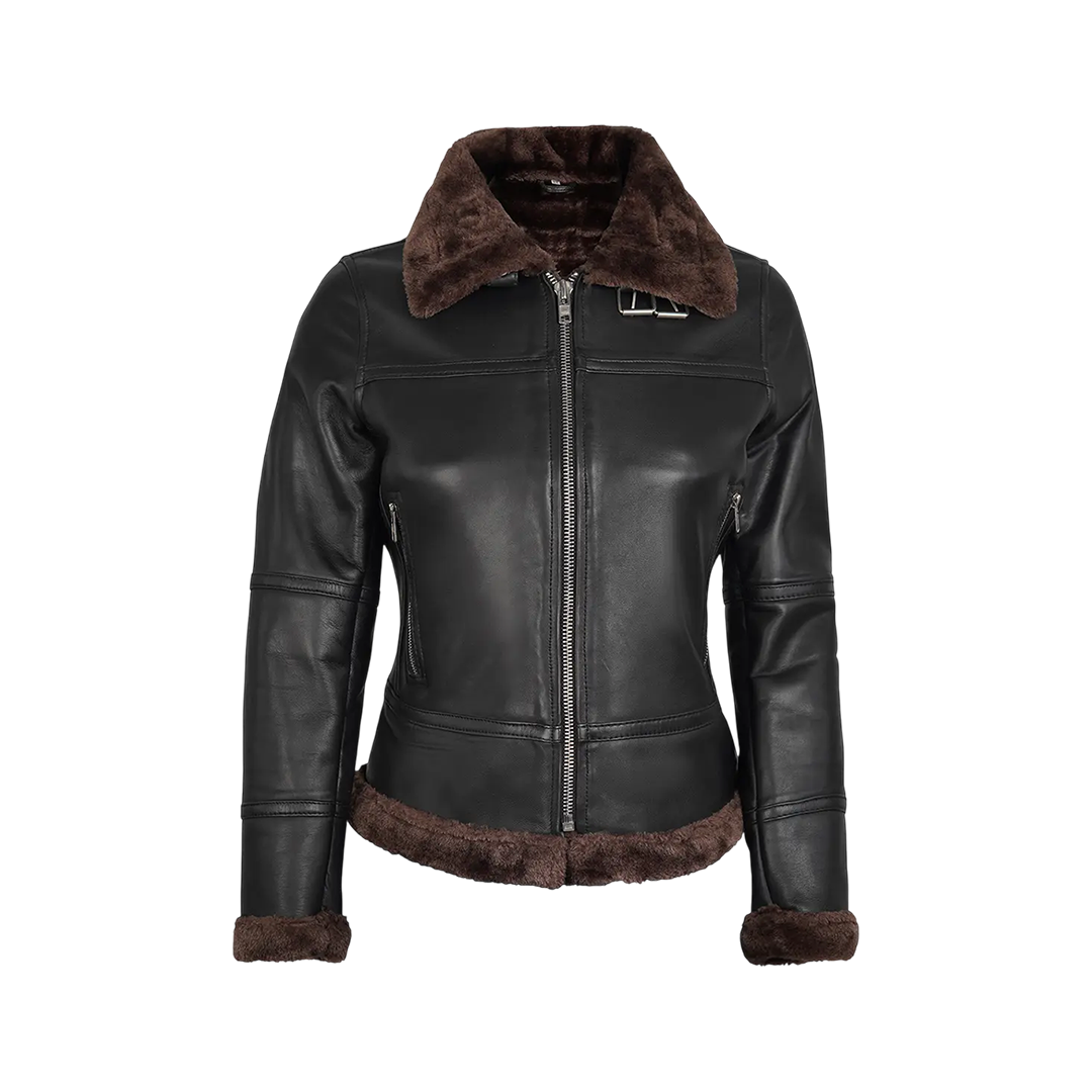 Stay ahead of the cold in style with our Women’s Dark Brown Shearling Bomber Jacket — a winter essential that blends classic aviator charm with modern-day warmth and comfort.