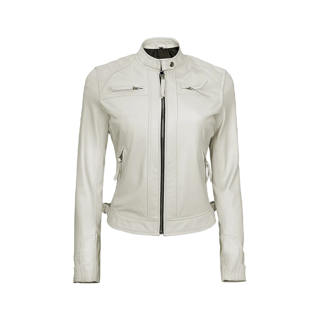 Elevate your outerwear with the Women’s Off White Diamond Moto Jacket — a sleek, modern essential designed to blend minimalist tones with moto-inspired confidence.