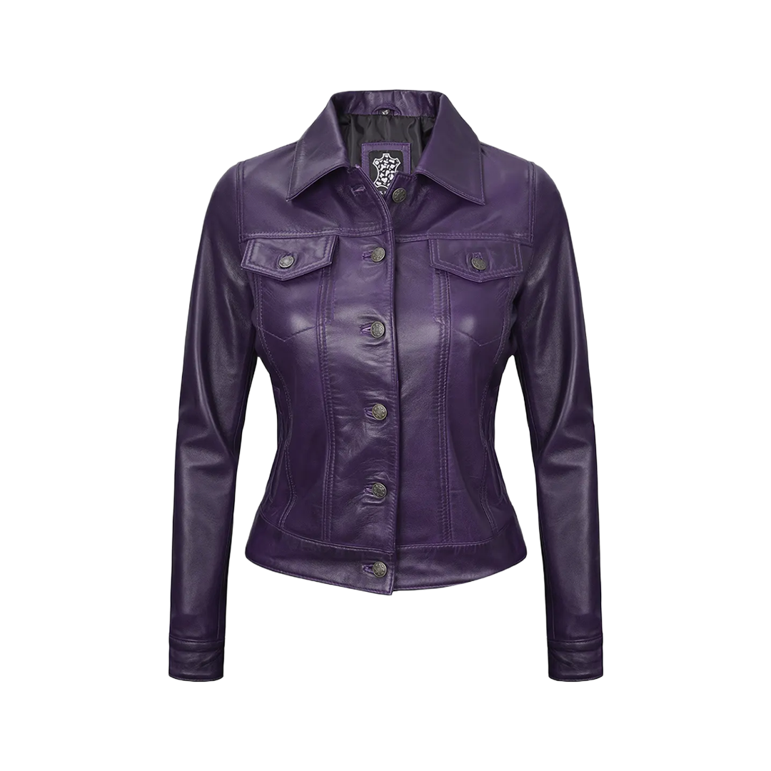 Make a bold fashion statement with this luxurious purple leather trucker jacket, expertly crafted for the confident, style-savvy woman. The vibrant royal hue and premium lambskin construction create a head-turning piece that blends edgy sophistication with everyday wearability.