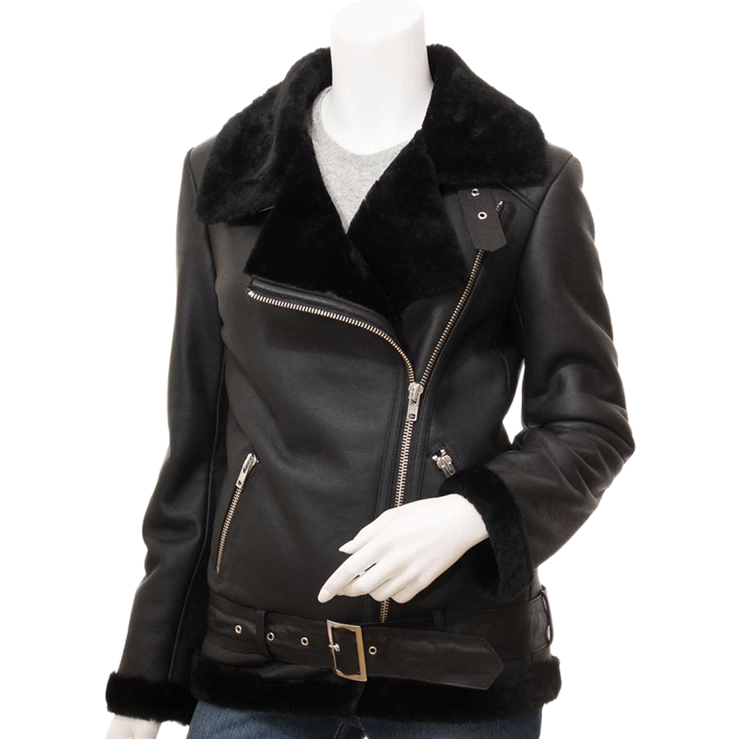Tough meets luxe in this women’s black shearling biker jacket — a bold silhouette crafted from rich sheepskin for unbeatable warmth and timeless edge.