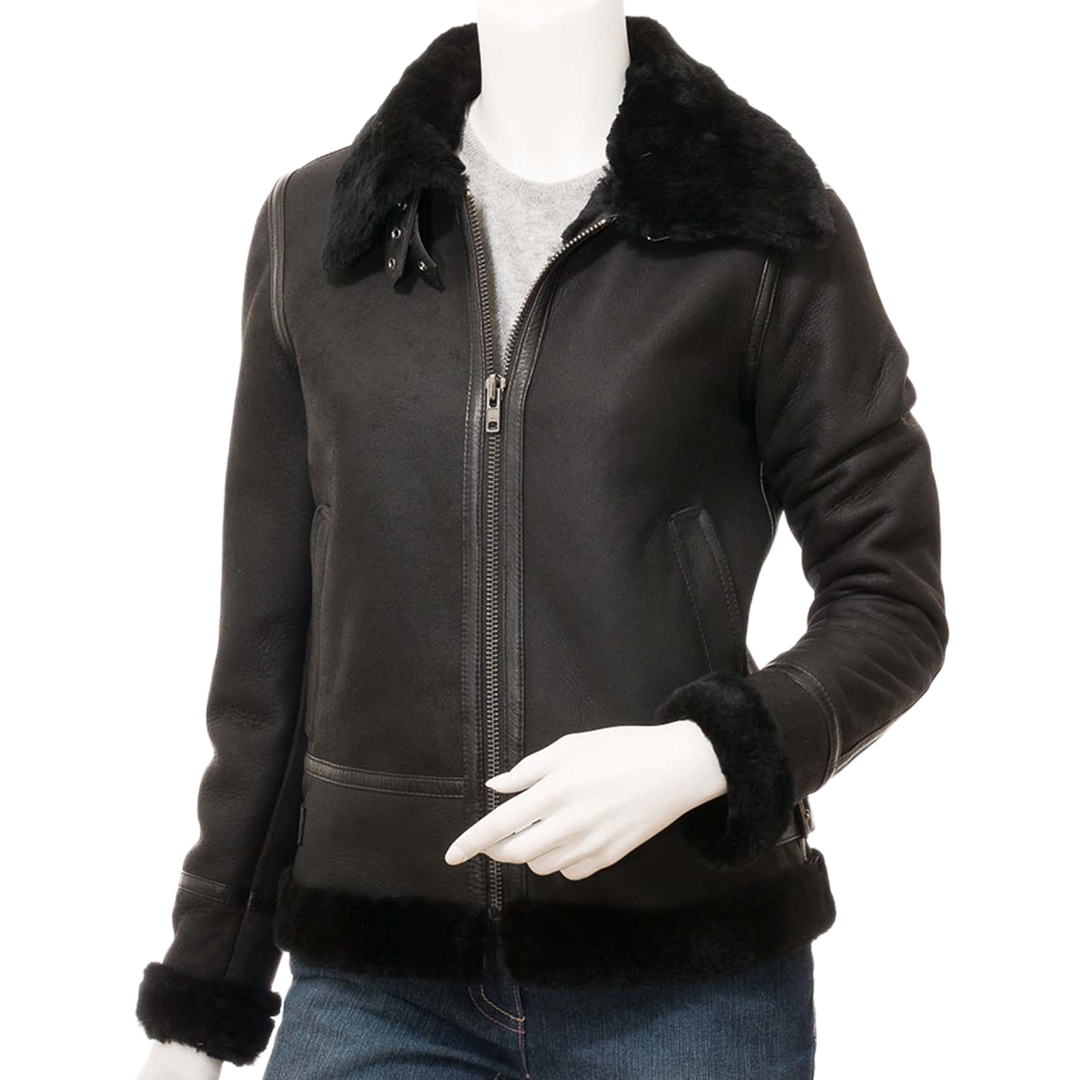 Clean, bold, and timeless — this women’s black shearling bomber jacket offers a modern twist on a classic silhouette, all wrapped in luxe sheepskin warmth.
