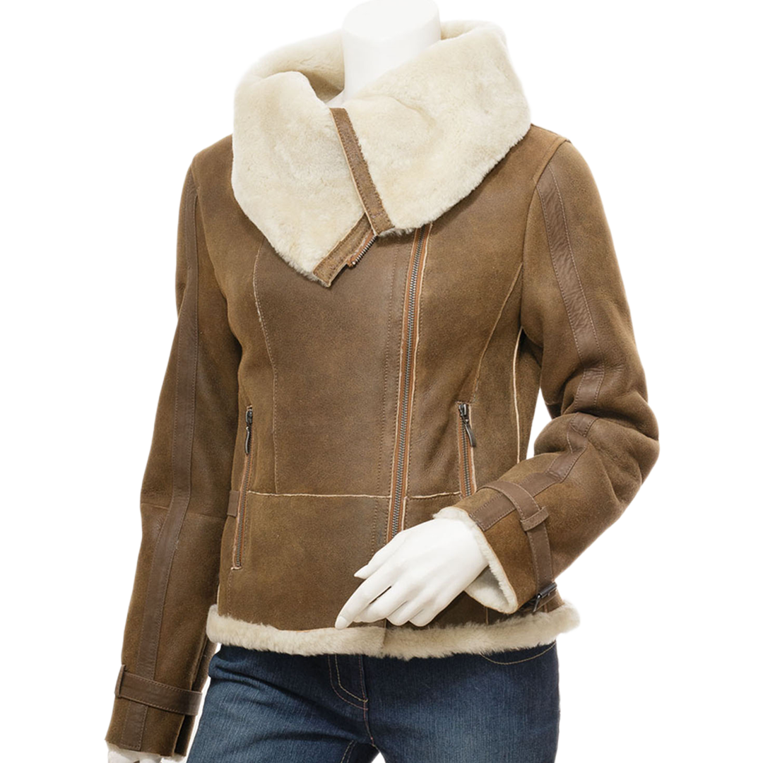 Bold yet refined, this women’s tan bomber sheepskin jacket blends biker edge with luxurious warmth — a standout piece for crisp winter days.