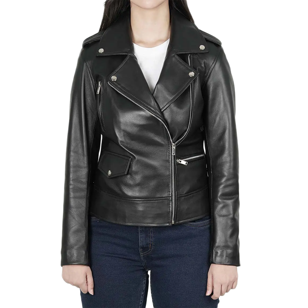 For the woman who dares to stand out, the Asymmetrical Black Leather Biker Jacket is a go-to layer that never goes out of style.