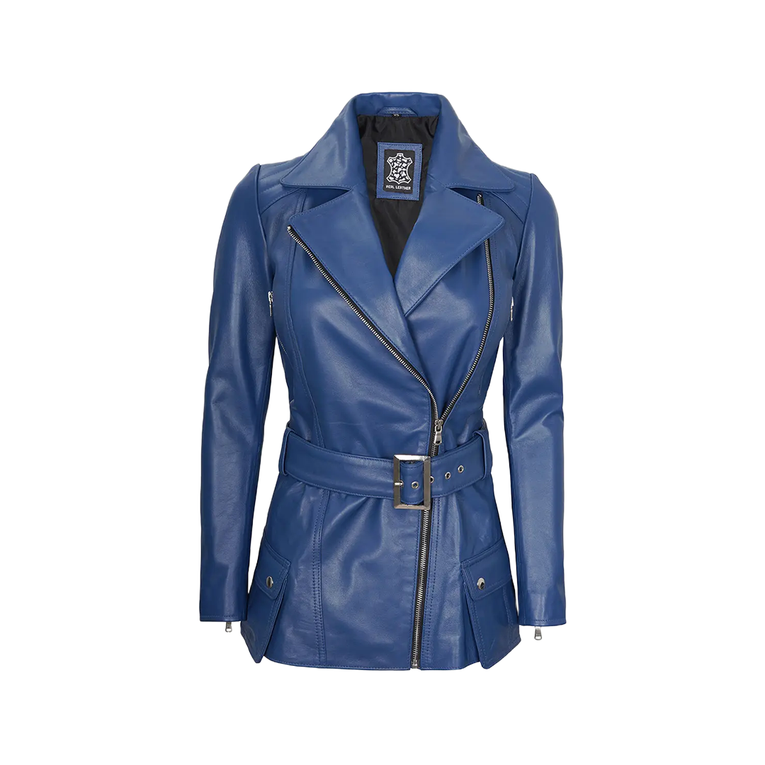 Step into bold sophistication with the Women’s Blue Asymmetrical Belted Jacket — where timeless biker design meets fresh, fashion-forward energy.