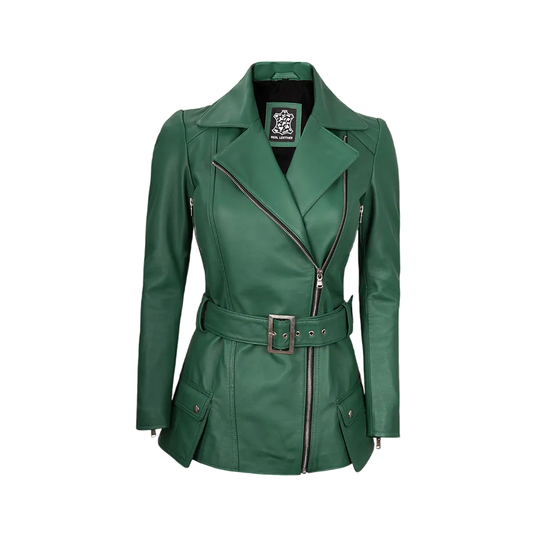 Effortlessly combine edgy flair with tailored elegance in our Women’s Asymmetrical Green Belted Leather Jacket — a standout piece for the modern woman who marches to her own beat. The rich green hue and sculpting design deliver a powerful style statement.