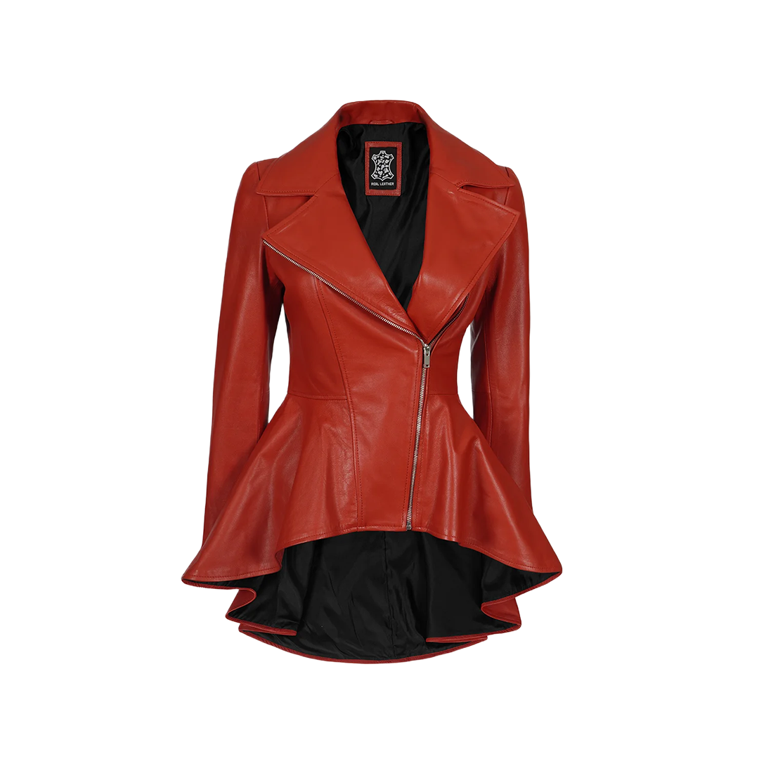 Bring fearless femininity to your wardrobe with this bold red leather peplum jacket — where biker edge meets tailored elegance in one unforgettable silhouette.
