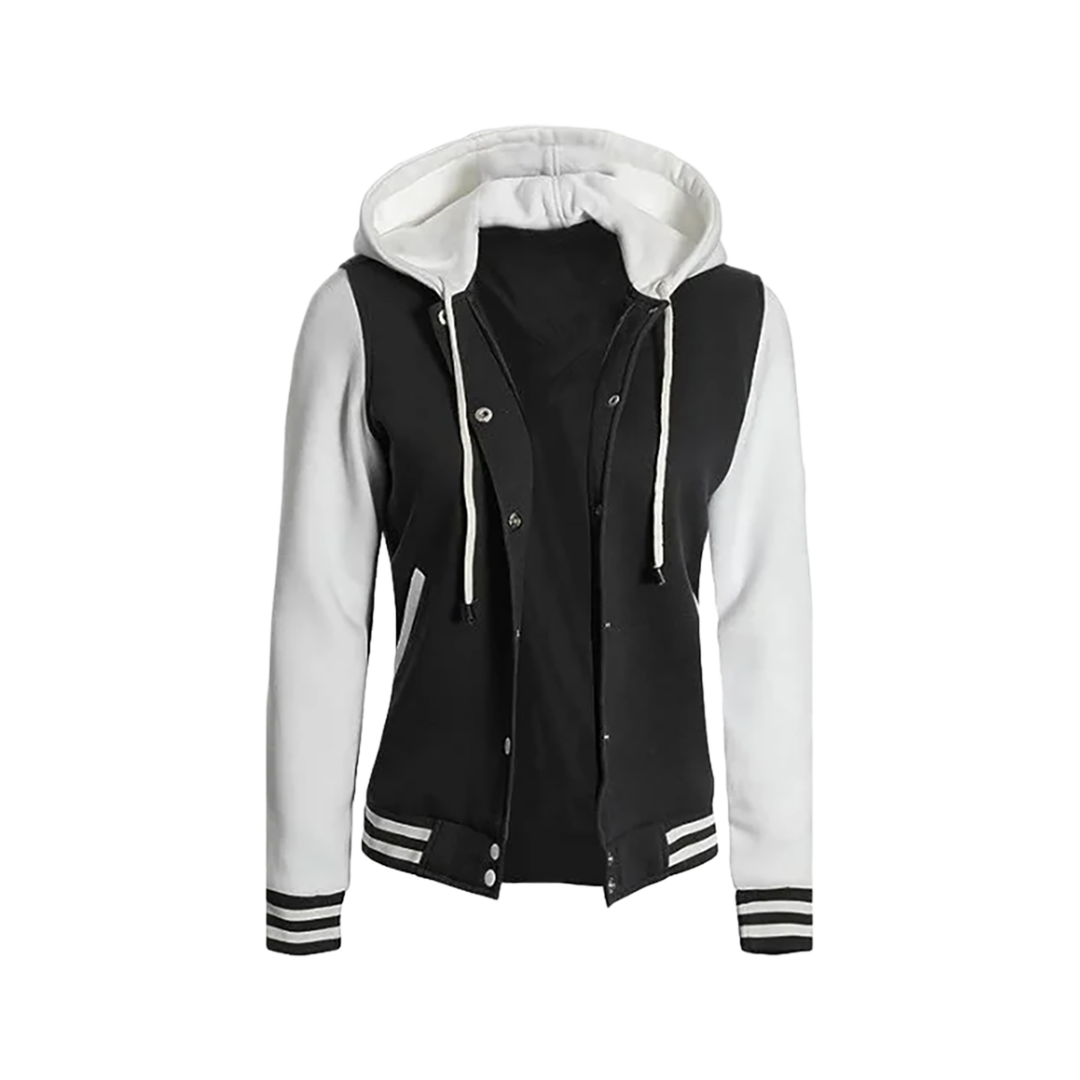 Amplify your wardrobe with the Women's Black and White Varsity Jacket with Hood — a perfect fusion of timeless varsity charm and modern-day functionality. Designed for women who appreciate stylish details and year-round versatility, this jacket is your go-to for campus days, casual hangouts, or sporty streetwear vibes. The added hood provides extra warmth and style, making it ideal for layering in cooler weather.