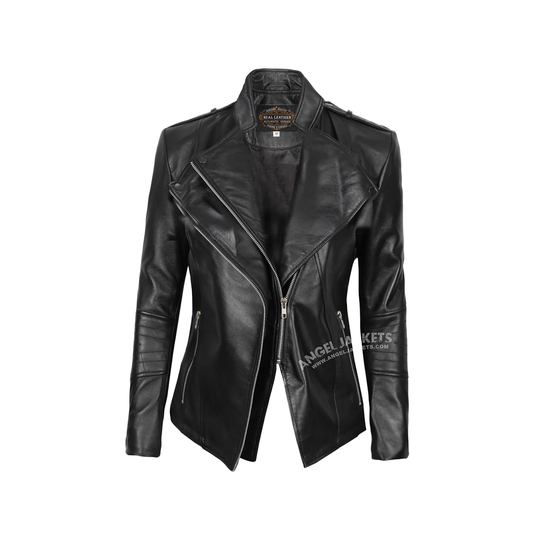 Make this women’s asymmetrical black leather biker jacket your go-to for fierce confidence and versatile styling. Perfect for every bold move.
