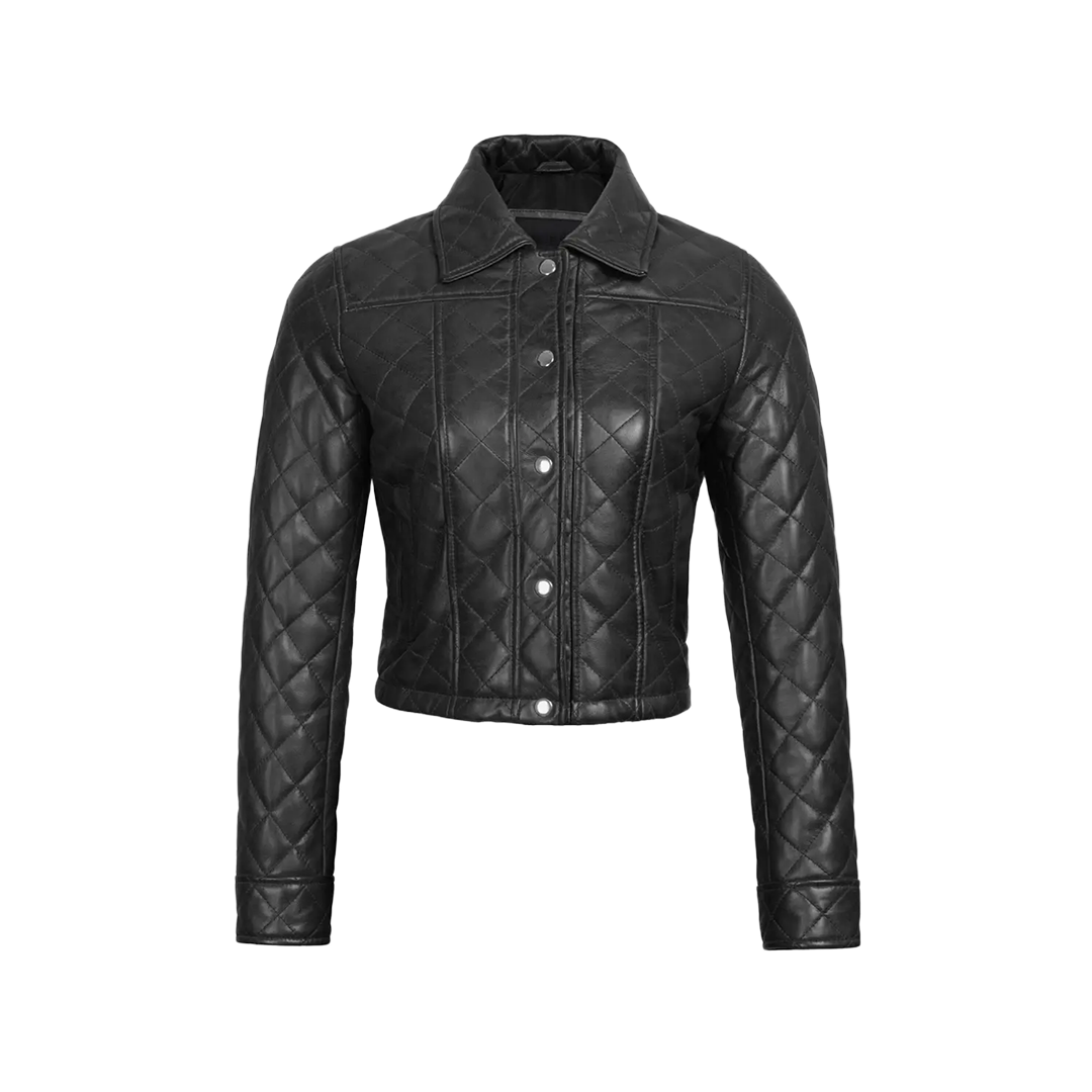 For a confident and elevated look, the black quilted cropped leather jacket delivers style that’s anything but ordinary.