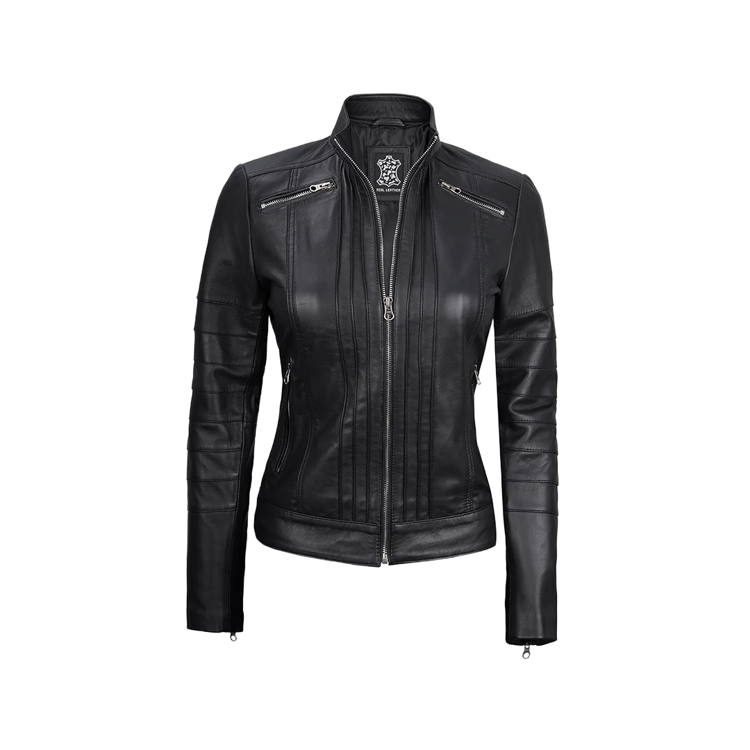 Channel timeless confidence with this Women's Black Cafe Racer Jacket, a modern take on a classic design. Crafted from 100% real lambskin leather, it blends clean lines, rich texture, and everyday wearability—perfect for the woman who values both elegance and edge.