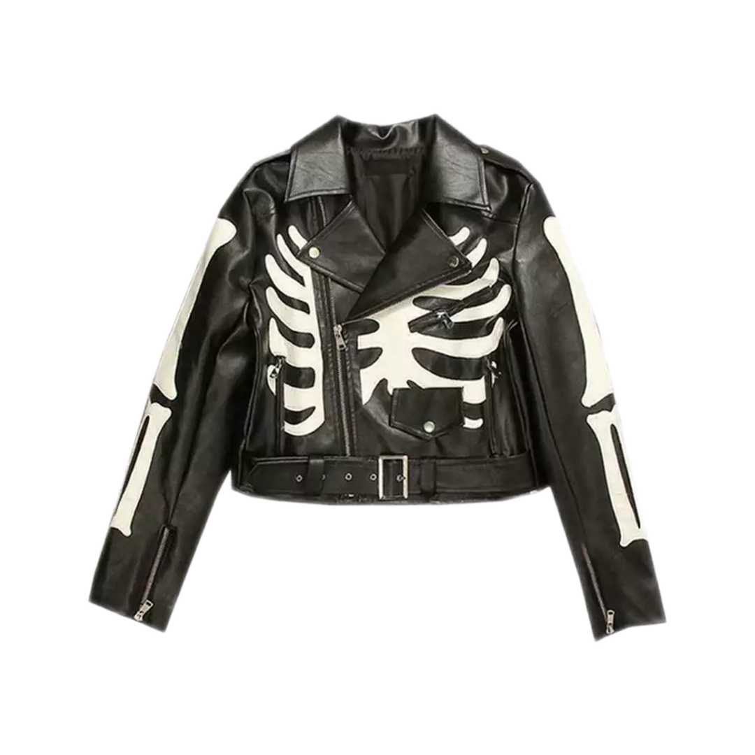 Available in both high-grade sheepskin leather and premium faux leather, this jacket delivers top-tier style with cruelty-free options. The iconic white skeleton detailing on a black base gives it a visually striking look — ideal for themed events, concerts, or daily wear with attitude.