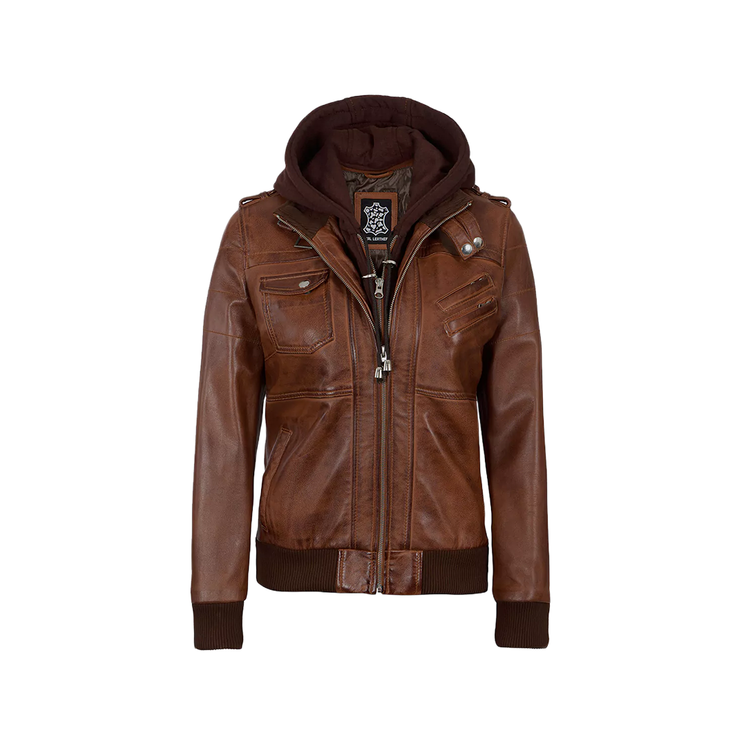 Whether you're heading out for coffee or catching a flight, the Cognac Brown Bomber Jacket with Removable Hood is the piece you'll reach for again and again—polished, practical, and always in style.