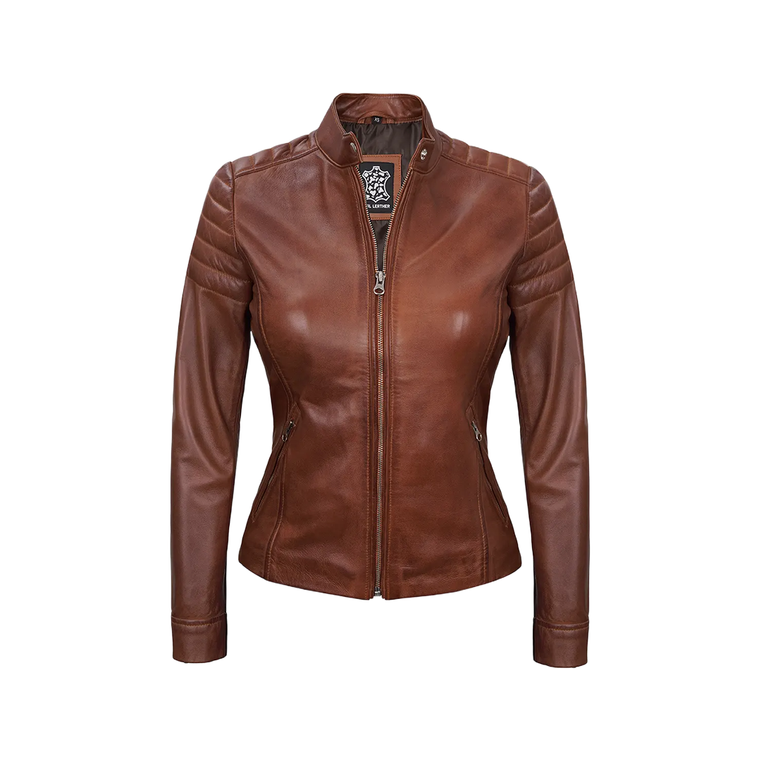 Rev up your wardrobe with the Women's Cognac Brown Cafe Racer Leather Jacket—a timeless piece that merges moto-inspired detailing with a refined, feminine touch. With its rich hue and minimalist lines, this jacket is built to impress both on and off the road.