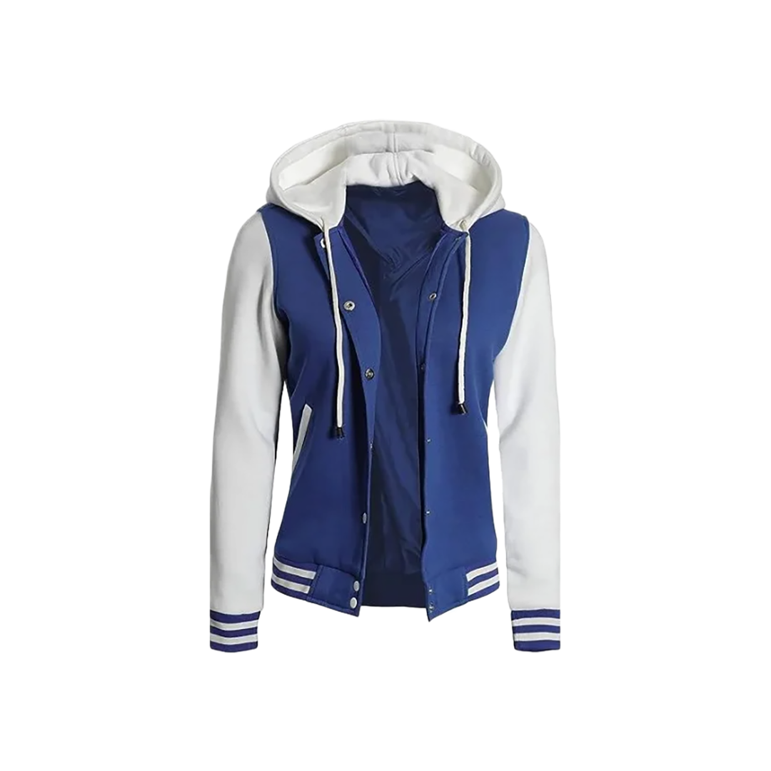 Revamp your sporty style with the Women's Blue and White Varsity Jacket with Hood. This eye-catching jacket blends timeless varsity aesthetics with a modern twist, offering the perfect mix of casual chic and everyday comfort. Whether you're heading to a game or enjoying a laid-back night out, the bold blue and white color combo and practical hood keep your style effortlessly on point.
