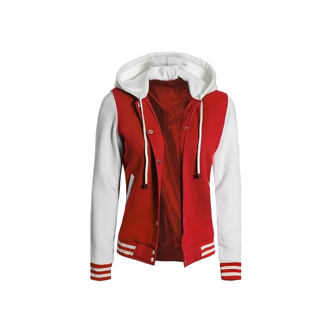 Elevate your sporty fashion game with the Women's Red and White Varsity Jacket with Hood. This stylish piece blends classic varsity charm with modern comfort, making it the perfect go-to jacket for game days, casual outings, or layering in cooler weather. With its striking color combo and added hood, it’s both fashionable and functional.