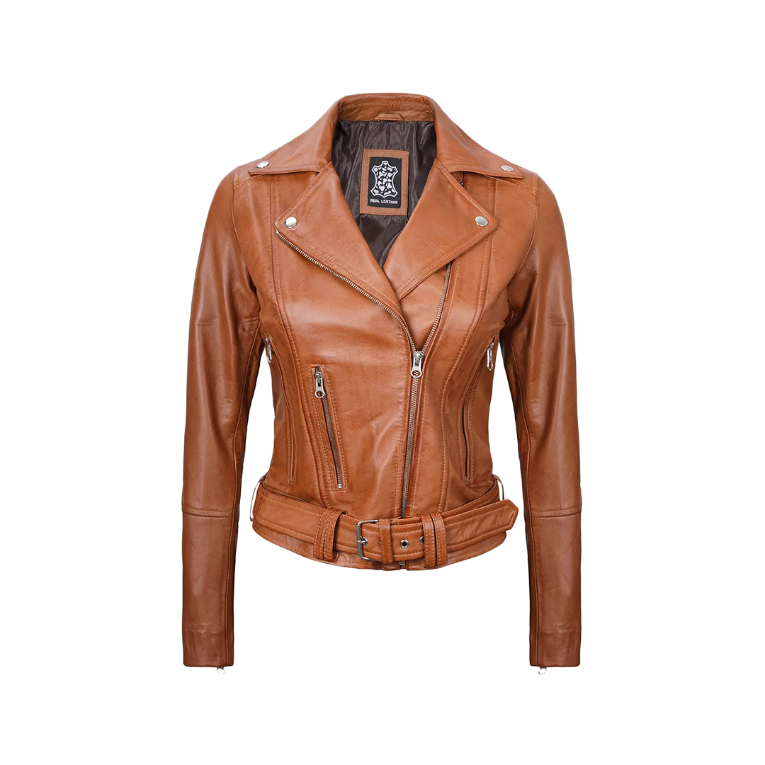 Expertly crafted from 100% real lambskin leather, this jacket features a light brown finish that adds warmth and sophistication. The asymmetrical zip closure, detailed seaming, and waist belt combine to deliver a striking silhouette with a flattering fit.