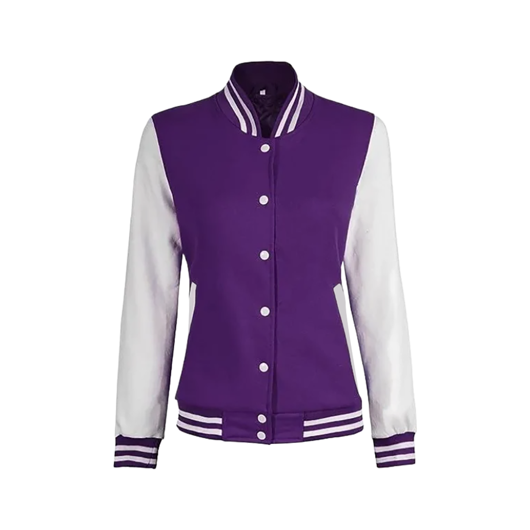 Upgrade your wardrobe with the Women's Purple and White Letterman Jacket — a perfect blend of vintage varsity charm and modern street-style flair. Designed for women who value comfort and confidence, this bomber-style jacket features a flattering fit, bold color contrast, and premium materials for long-lasting wear.